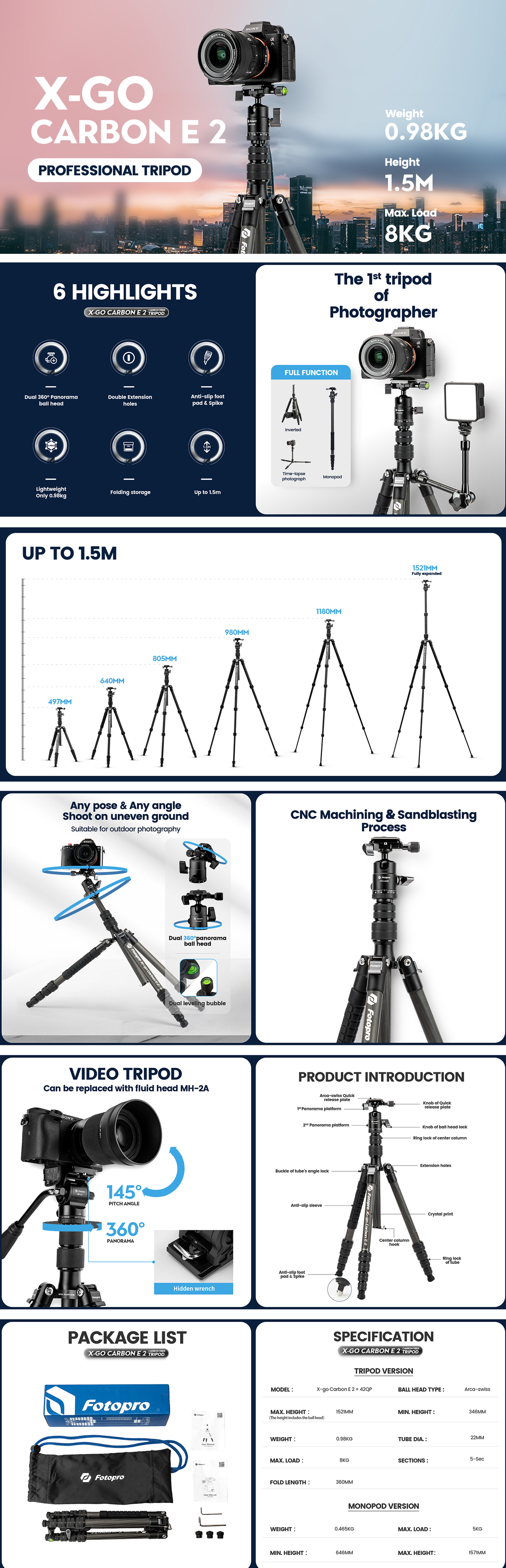 1. X-go E 2 series is full functional carbon fiber tripod for photography.