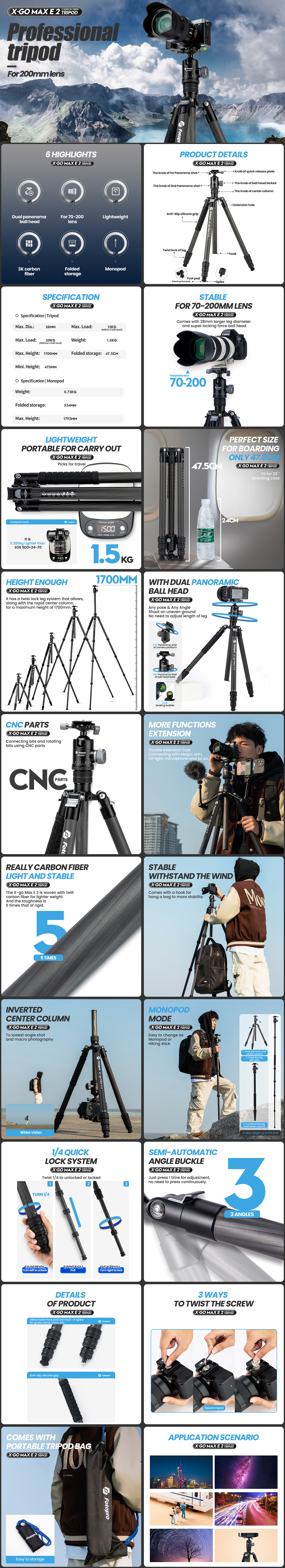 1. X-go E 2 series is full functional carbon fiber tripod for photography.